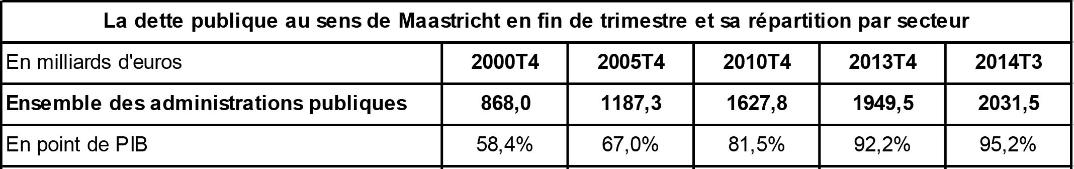 Remarque 1 : la dette représente 952 € pour 1000 € de richesse produite à la fin du 3ème trimestre 2014 (la dette est de 95,2% du PIB).