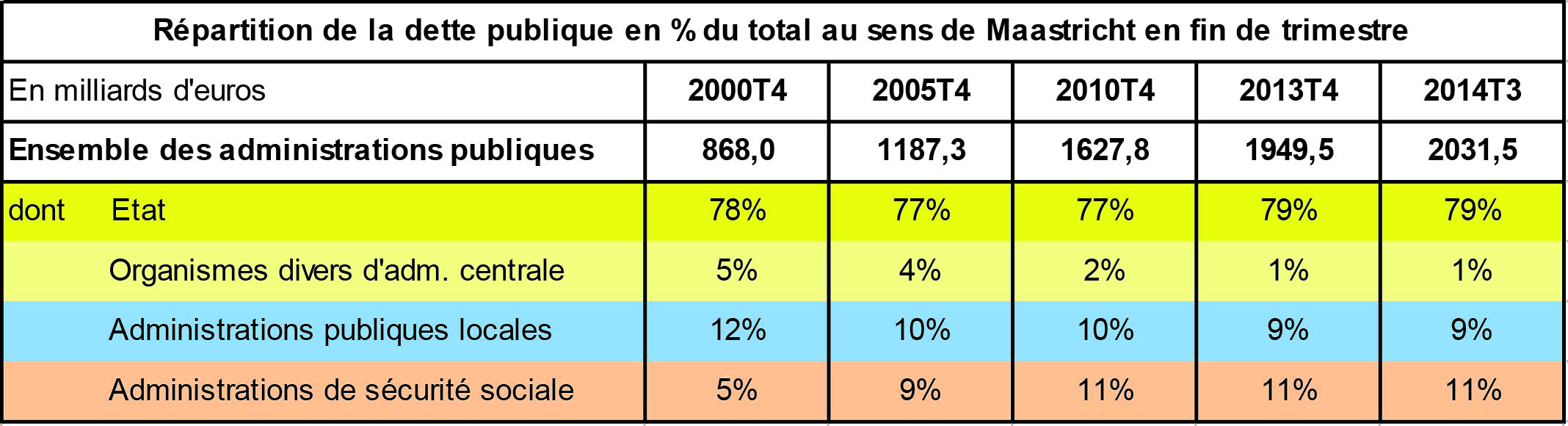 Remarque 2 : la dette de l’Etat est la plus importante. Suivent celle des administrations de sécurité sociale puis celle des collectivités locales.