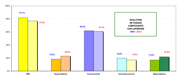 stable dans le mode l’utilisation du total des biens et services utilisés (61%), une hausse des exportations qui correspond en lien avec l’augmentation de la valeur du PIB (les exportations qui représentaient 21 % du PIB en représentent 28 % en 2013). Mais la part l’investissement dans le mode l’utilisation du total des biens et services utilisés baisse (- 3%) sur la période. D’ailleurs l’investissement ne représente plus que 22 % du PIB en 2013, alors qu’il en représentait 24 % en 1980.